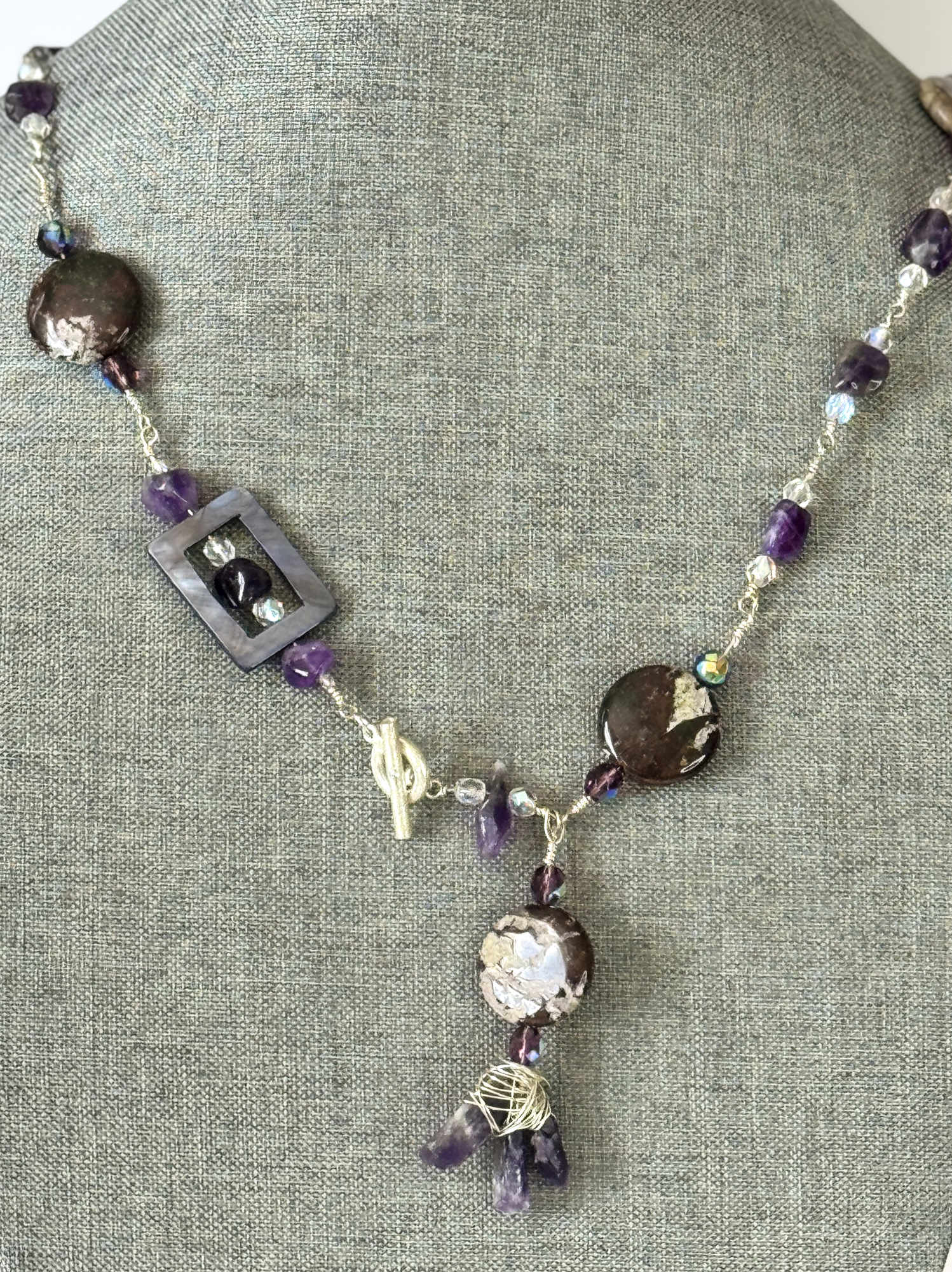 A stunning blend of amethyst, silver, and fire-polished crystals, this long asymmetrical necklace radiates effortless elegance. With its graceful tassel and sterling silver clasp, it’s a timeless piece that adds a touch of sparkle and soul to any look